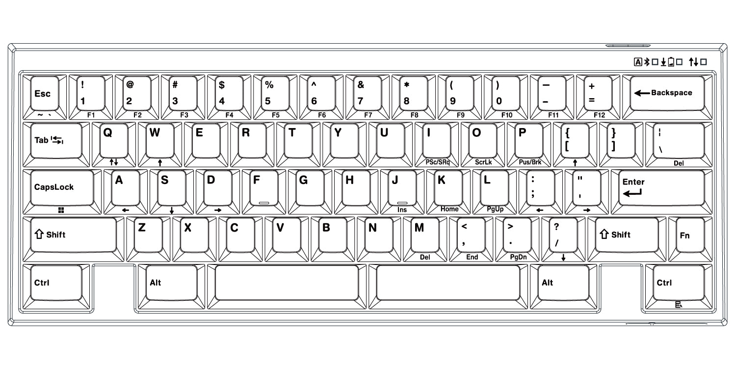 F1~F12やHome,End,PageUp,PageDownなどのキーを省略し、Fnキーとの合わせ押しで操作する、いわゆる"60%サイズ"。Windows OS登場以前のキーボードを彷彿とさせるWKL(WindowsKeyless)なシンメトリーデザインで、懐かしさと新しさが共存。