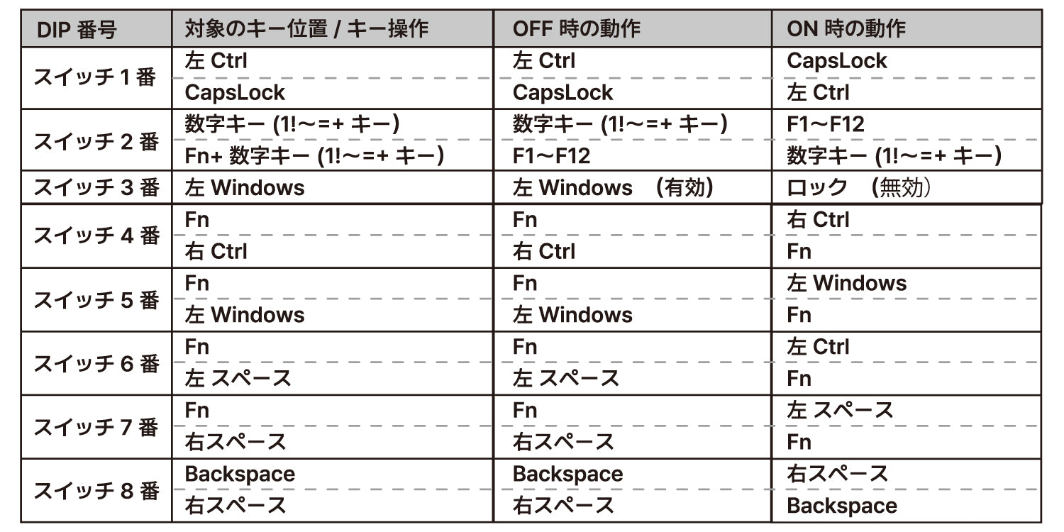 背面にDIPスイッチを搭載し、CapsLockキーと左Ctrlキーの入れ替えなど、所定のキーコード割り当ての切り替えをキーボード本体で行うことができます。また、スプリットスペースキーのいずれかをFnキーに入れ替えるなどの操作も可能です。