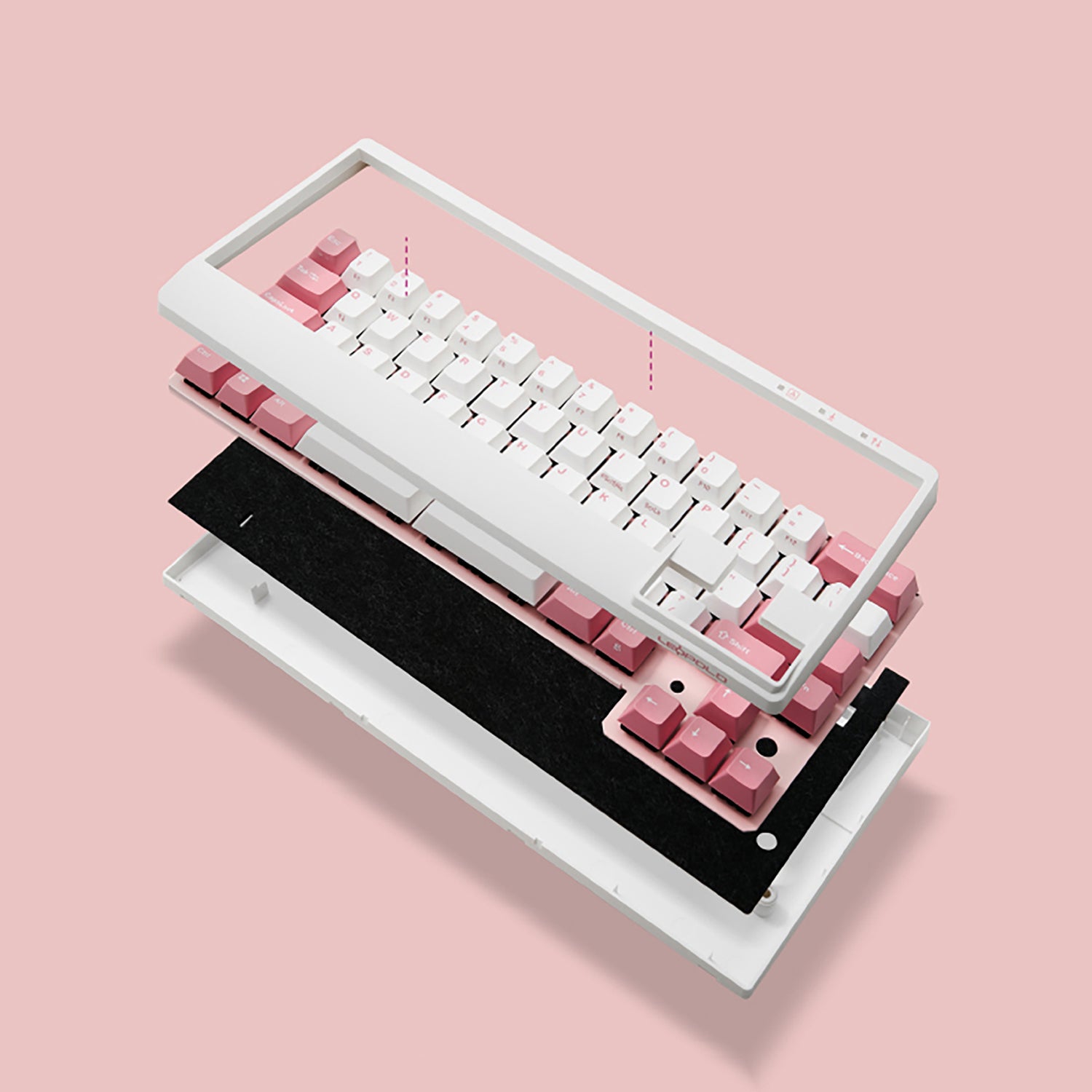 スイッチレバーが戻る際、鉄板キーブラケットが共振することで発生する反響音が、筐体内の空洞部で響くのを軽減するため、下ケース上に消音パッドを内蔵しています。キーボードだけでなく、構造上反響音が大きくなりがちな、スペースキー裏面にも設置しています。
