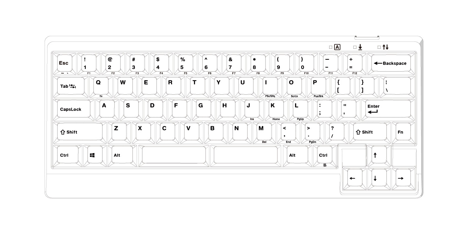 F1~F12やHome,End,PageUp,PageDownなどのキーを省略し、Fnキーとの合わせ押しで操作する、いわゆる"60%サイズ"でありながら、コーディングなどでも使用頻度の高い、独立した矢印キーを搭載した、LEOPOLDオリジナルの新コンセプト配列。