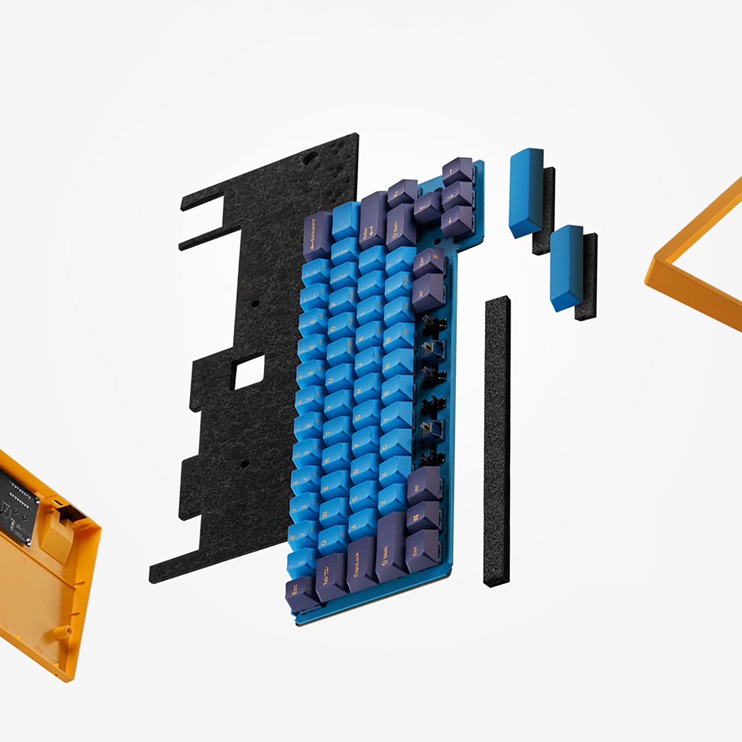 スイッチレバーが戻る際、鉄板キーブラケットが共振することで発生する反響音が、筐体内の空洞部で響くのを軽減するため、下ケース上に消音パッドを内蔵しています。キーボードだけでなく、構造上反響音が大きくなりがちな、スペースキー裏面にも設置しています。