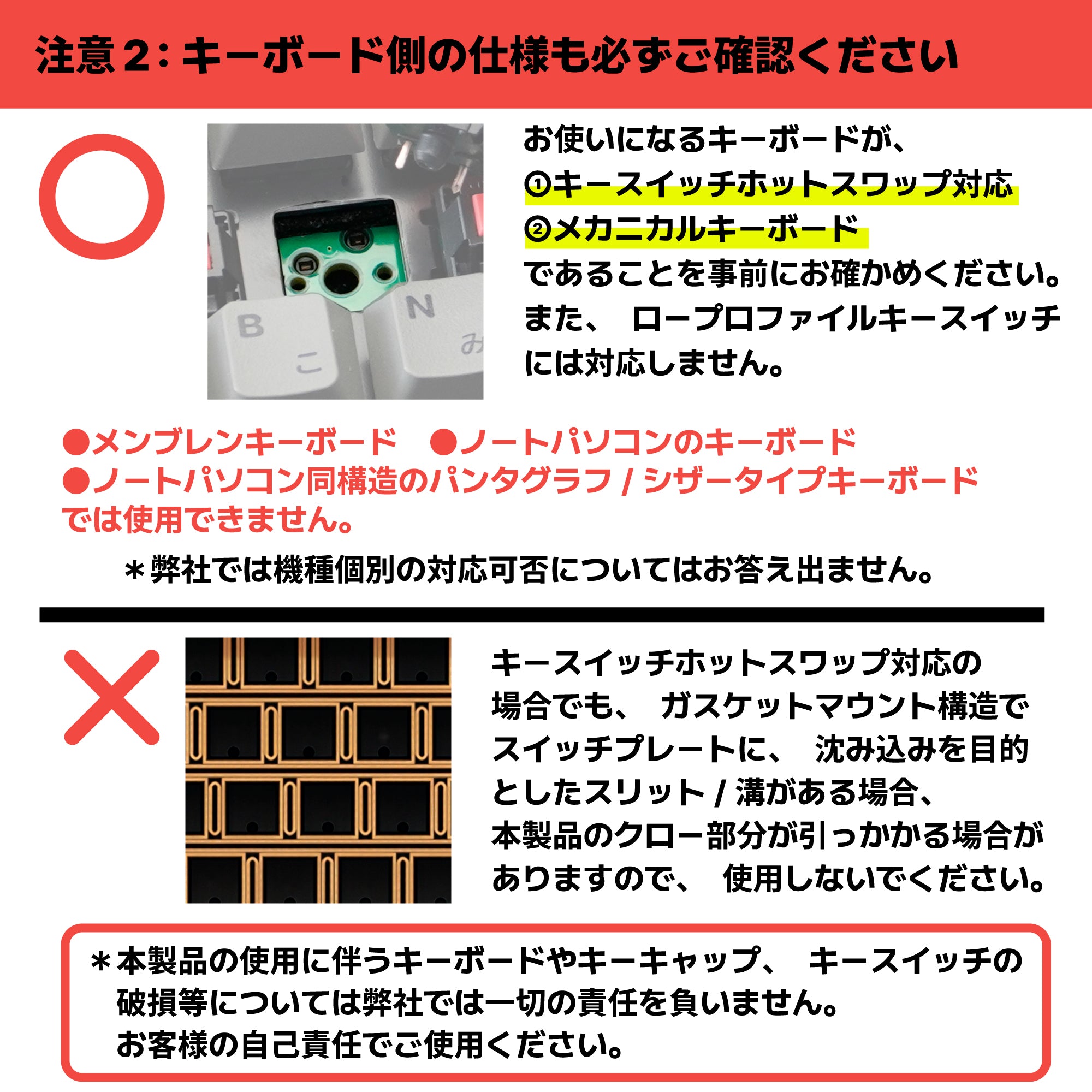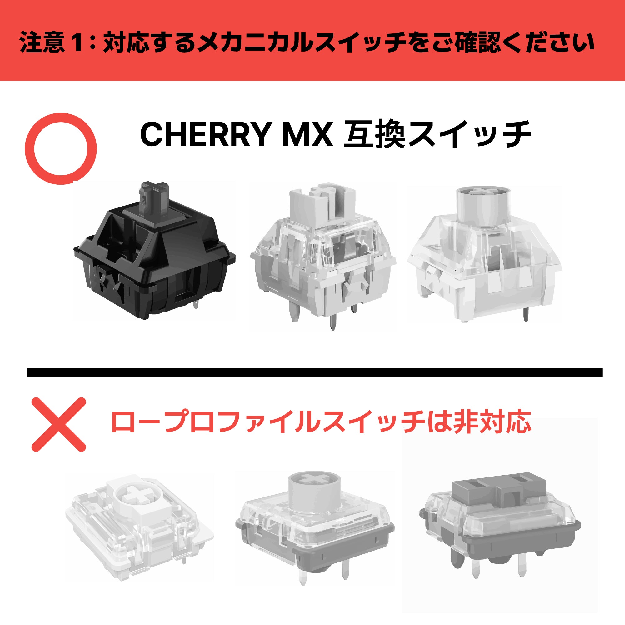 - ロープロファイル(低背)キースイッチには対応しません。